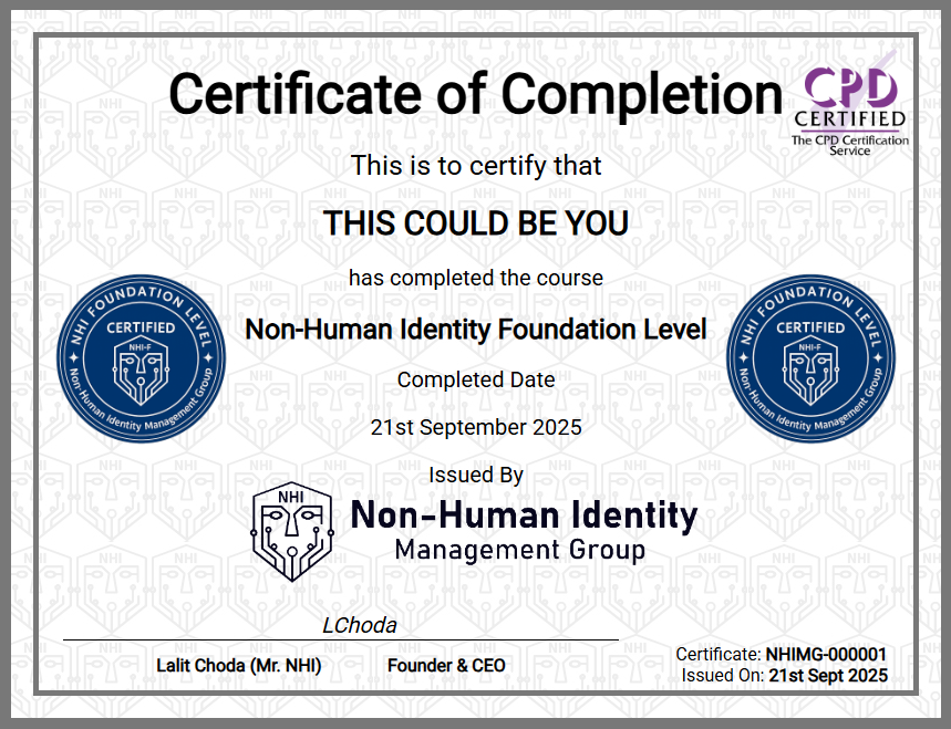 After completing the course and passing the final exam, you will receive your NHI Foundation Level Certification (with 8 hours of CPD credits), from the premier independent authority on NHIs, the NHI Mgmt Group, signed by our founder Mr. NHI.